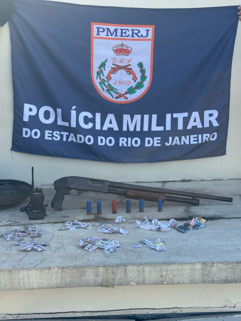 Na manhã desta terça-feira (8), uma operação precisa do GAT B resultou na prisão de um suspeito e na apreensão de uma espingarda calibre 12, farto material entorpecente, além de um rádio comunicador, no bairro Itambi, em Itaboraí.