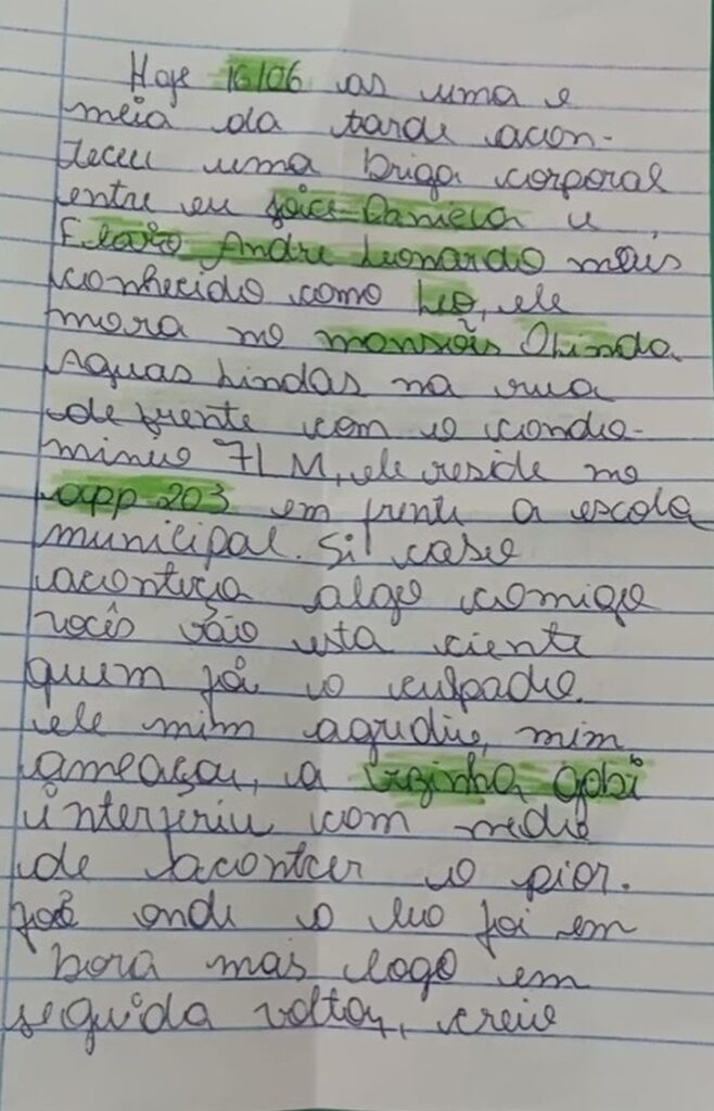 Na carta escrita e assinada a próprio punho, Joice Daniela descreve uma briga física com Flavio André, em 16 de junho. O bilhete foi achado por parentes dela, após o feminicídio, no apartamento em que a jovem morava, em Águas Lindas (GO).