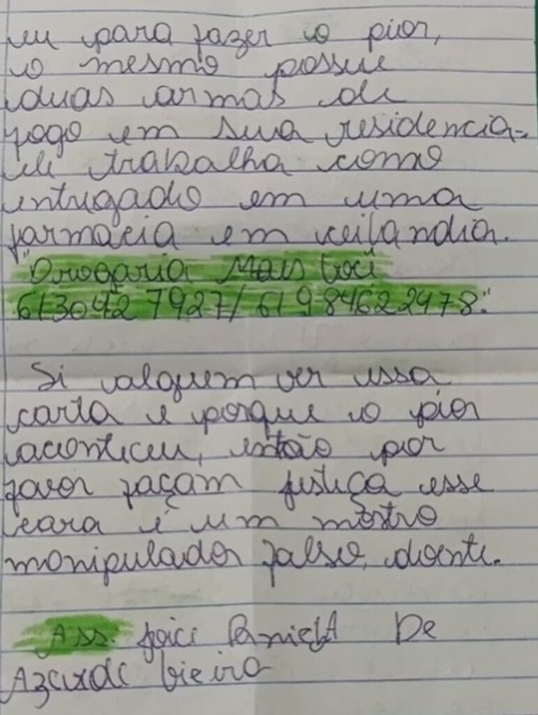 Ela também confessou ter medo de que o ficante a matasse. “[Ele] possui duas armas de fogo […]. Se alguém vir esta carta, é porque o pior aconteceu. Então, por favor, façam justiça”, pediu a jovem.